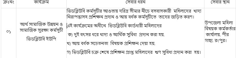 | ০১ | আর্থ সামাজিক উন্নয়ন ও সামাজিক সুরক্ষা কর্মসূচী ভিডব্লিউবি ইউপি | ভিডব্লিউবি কর্মসূচীর আওতায় দরিদ্র সীমার নীচে বসবাসকারী মহিলাদের খাদ্য নিরাপত্তাসহ প্রশিক্ষন প্রদান ও আয় বর্ধক কর্মসূচীতে তাদের জড়িত করণ। এই কার্যক্রমের অধীনে ভিডব্লিউবি কার্ডধারী মহিলাদের ক) দুই বৎসর ধরে খাদ্য ও আর্থিক সুবিধা প্রদান করা হয়, খ) আয় বর্ধক সচেতনতা বিষয়ক প্রশিক্ষন দেয়া হয়, গ) ভিডব্লিউবি চক্র শেষে প্রশিক্ষন প্রাপ্ত মহিলাদের ঋণ সুবিধা প্রদান করা হয়। ঘ) প্রতিটি ইউনিয়নে কিশোর-কিশোরীদের সংগিত ও আবৃত্তি বিষয়ক শিক্ষা প্রদান করা হয়। ঙ) গর্ববতী মা’দের মা ও শিশু সহায়তা প্রদান করা হয়। চ) নারী ও শিশু নির্যাতন এবং বাল্য বিবাহ প্রতিরোধ সংক্রান্ত ছ) স্বেচ্ছাধীন অনুদান প্রাপ্তির আবেদনের প্রেক্ষিতে সমিতির মাঝে অনুদান প্রদান। | উপজেলা মহিলা বিষয়ক কর্মকর্তার কার্যালয়, পীরগাছা, রংপুর। |